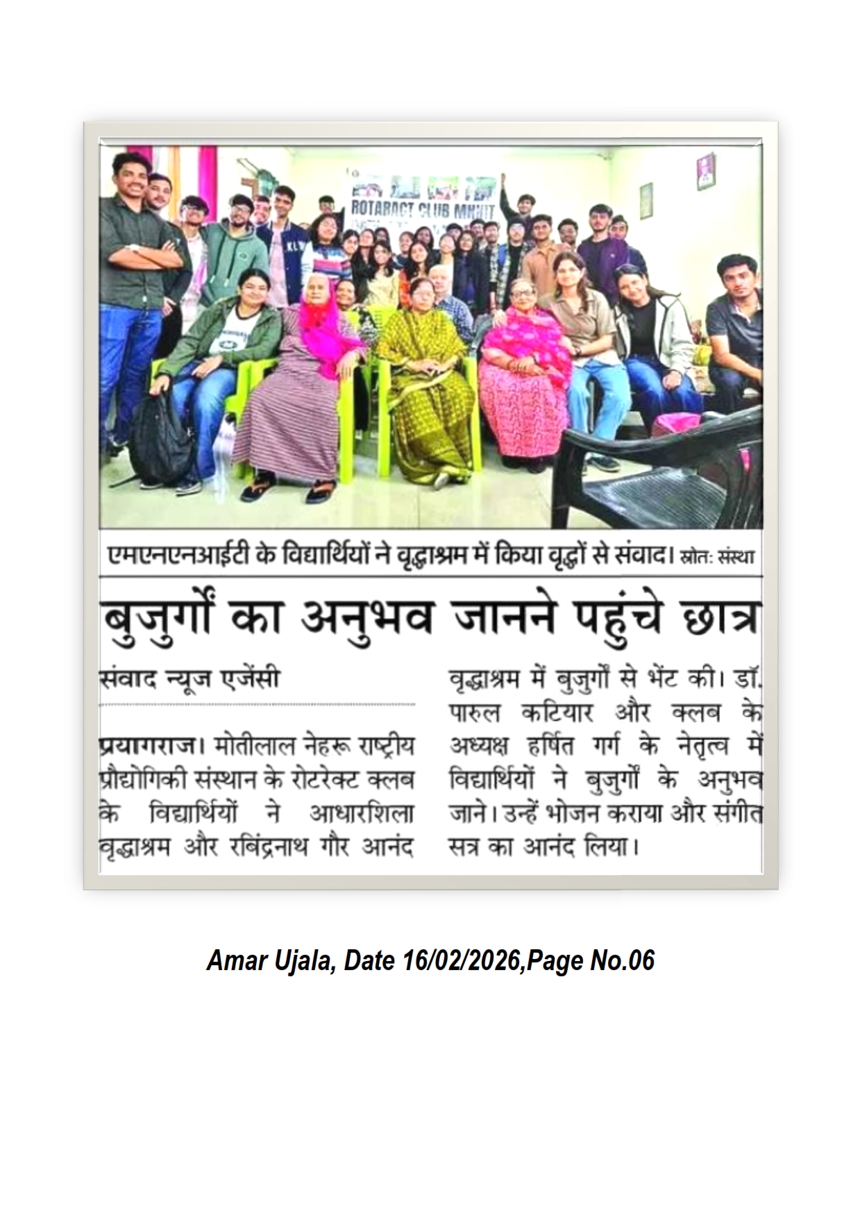 मोतीलाल नेहरु राष्ट्रीय प्रौद्योगिकी संस्थान इलाहाबाद के रोटरेक्ट क्लब के विद्यार्थियों ने आधारशिला वृद्धाश्रम और रविंद्रनाथ गौर आनंद वृद्धाश्रम में बुजुर्गों से भेंट की। डाॅ. पारुल कटियार और क्लब के अध्यक्ष हर्षित गर्ग के नेतृत्व में विद्यार्थियों ने बुजुर्गों के अनुभव जाने। उन्हें भोजन कराया और संगीत सत्र का आनन्द लिया। [Amar Ujala 16-02-2026, Page No. 06]-A