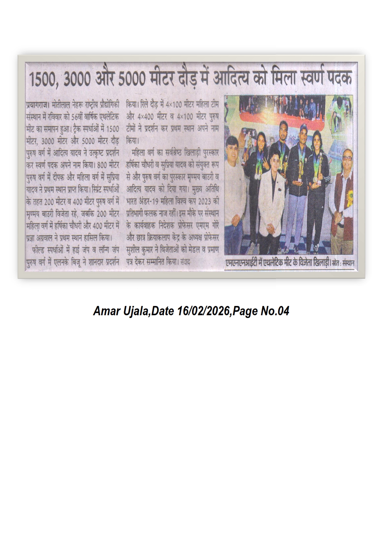 मोतीलाल नेहरु राष्ट्रीय प्रौद्योगिकी संस्थान इलाहाबाद में रविवार को 56वीं वार्षिक एथलेटिक मीट का समापन हुआ। ट्रैक स्पर्धाओं में 1500 मीटर, 3000 मीटर और 5000 मीटर दौड़ में पुरुष वर्ग में आदित्य यादव ने उत्कृष्ट प्रदर्शन कर स्वर्ण पदक अपने नाम किया। मुख्य अतिथि भारत अंडर-19 महिला विश्व कप 2023 की प्रतिभागी फलक नाज रहीं। इस मौके पर संस्थान के कार्यवाहक निदेशक प्रो. एम. एम. गोरे और छात्र क्रियाकलाप केन्द्र के अध्यक्ष प्रो. सुशील कुमार ने विजेताअें को मेडल व प्रमाण पत्र देकर सम्मानित किया। [Amar Ujala 16-02-2026, Page No. 04]-B