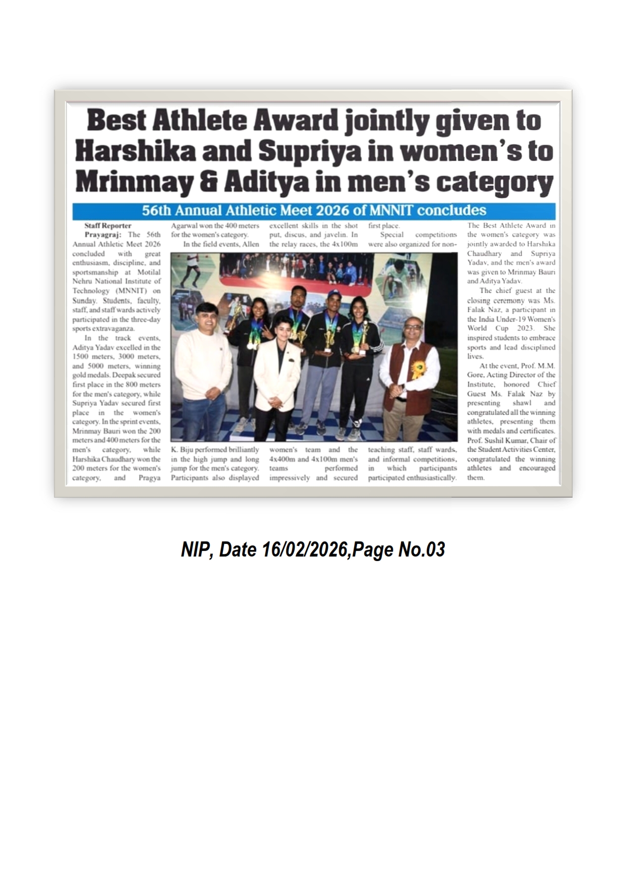 The 56th Annual Athletic Meet 2026 concluded with great enthusiasm, discipline and sportsmanship at Motilal Nehru National Institute of Technology Allahabad on Sunday. Students, faculty and staff wards actively participated in the three-day sports extravaganza. The chief guest at the closing ceremony was Ms. Falak Naz a participant in the India Under-19 Women's World Cup 2023. At the event, Prof. M. M. Gore, Acting Director of the Institute honoured Chief Guest Ms. Falak Naz by presenting shawl and congratulated all the winning athletes, presenting them with medals and certificates. [NIP 16-02-2026, Page No. 03]