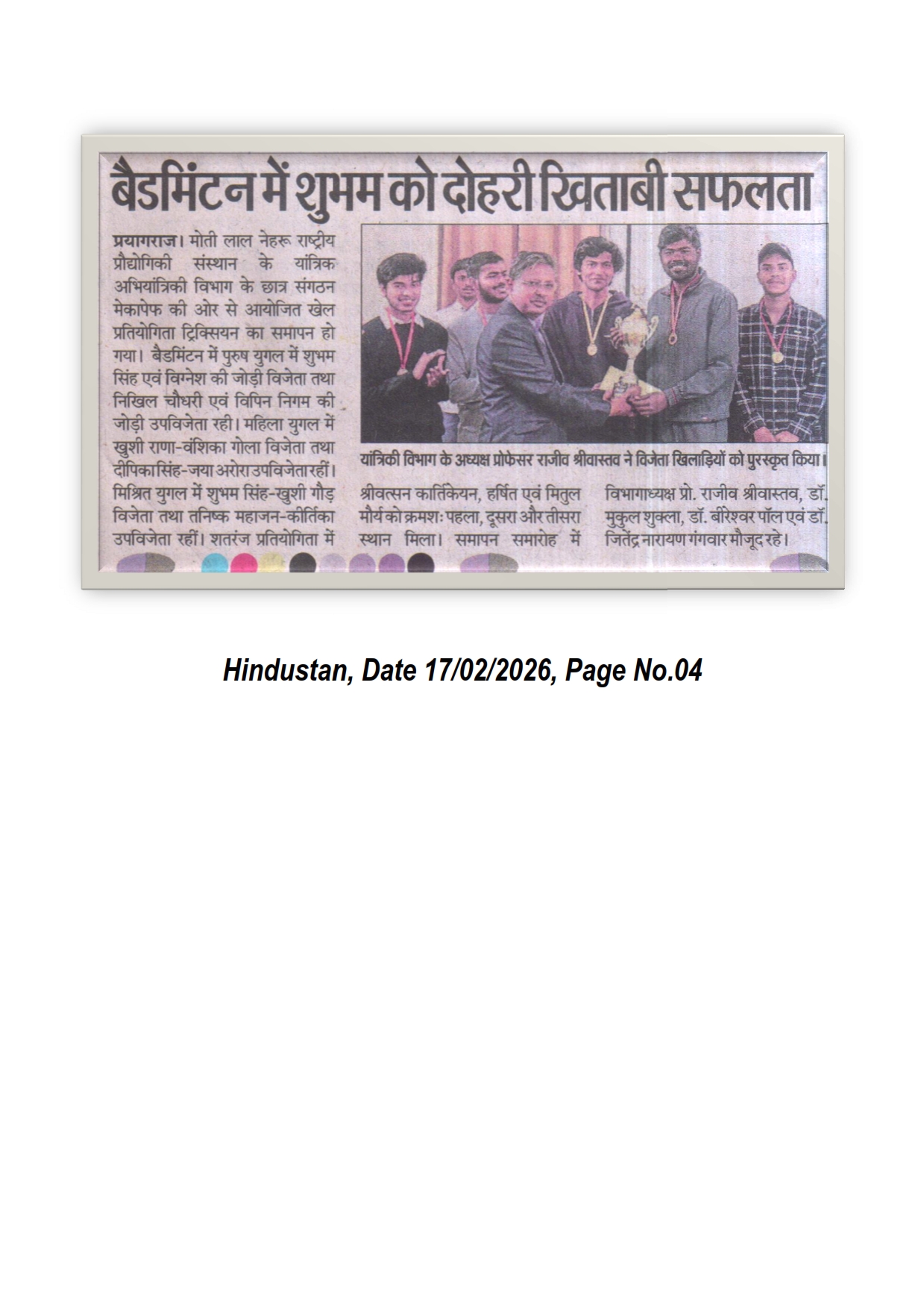 मोतीलाल नेहरु राष्ट्रीय प्रौद्योगिकी संस्थान इलाहाबाद के यांत्रिक अभियांत्रिकी विभाग के छात्र संगठन मेकापेफ की ओर से आयोजित खेल प्रतियोगिता ट्रिक्सियन का समापन हो गया। बैडमिंटन में पुरुष युगल में शुभम सिंह एवं विग्नेश की जोड़ी विजेता तथा निखिल चैधरी एवं विपिन निगम की जोड़ी उपविजेता रही। समापन समारोह में विभागाध्यक्ष प्रो. राजीव श्रीवास्तव, डाॅ. मुकुल शुक्ला, डाॅ. बिरेश्वर पाॅल एवं डाॅ. जितेंद्र नारायण गंगवार मौजूद रहे। [Hindustan 17-02-2026, Page No. 04]