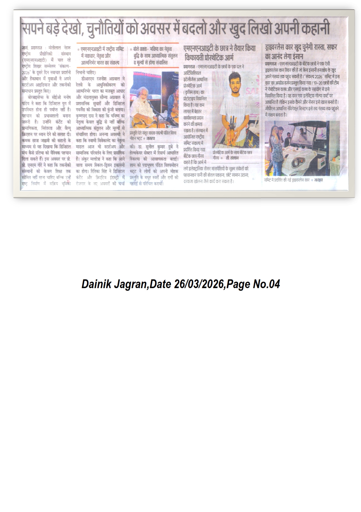 मोतीलाल नेहरु राष्ट्रीय प्रौद्योगिकी संस्थान इलाहाबाद में डिजाइन इनोवशन सेंटर के तत्वावधान में आयोजित संकल्प-2026 का दूसरा दिन स्किलिंग एंड नर्चरिंग नॉलेज फॉर आत्मनिर्भर लीडरशिप एंड प्रोस्पेरिटी विषय के साथ संपन्न हुआ। पहले पैनल सत्र में मनीष पांडेय ने बताया कि सोशल मीडिया के प्रभावी उपयोग से पहचान और आर्थिक आत्मनिर्भरता कैसे हासिल की जा सकती है। संस्थान के आरजीआईए के डीन प्रो. एम.एम.गोरे ने कहा कि केवल अकादमिक सफलता पर्याप्त नहीं, बल्कि व्यापक दृष्टिकोण और सामाजिक समझ भी आवश्यक है। [Amar Ujala 26-03-2026, Page No. 06]