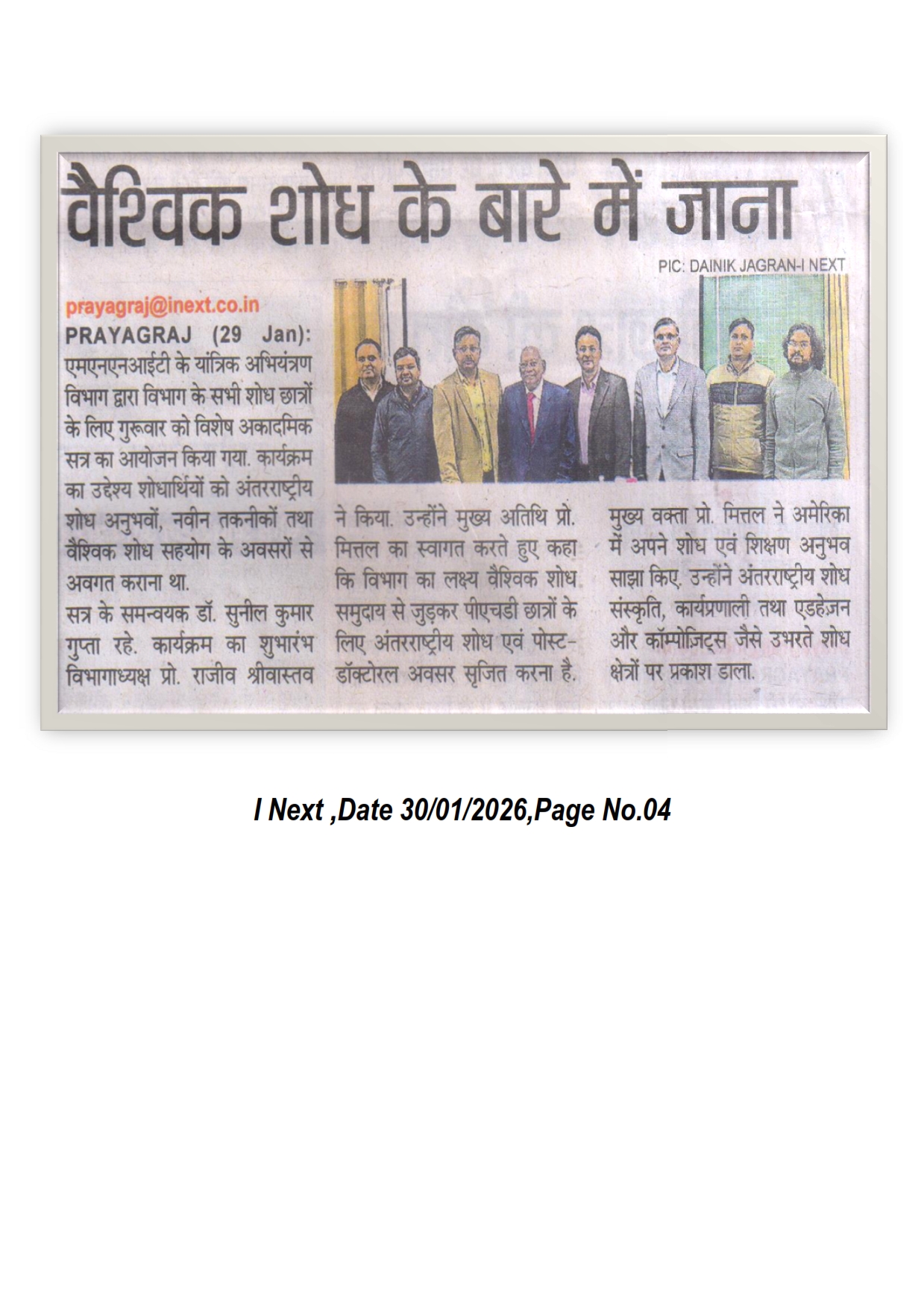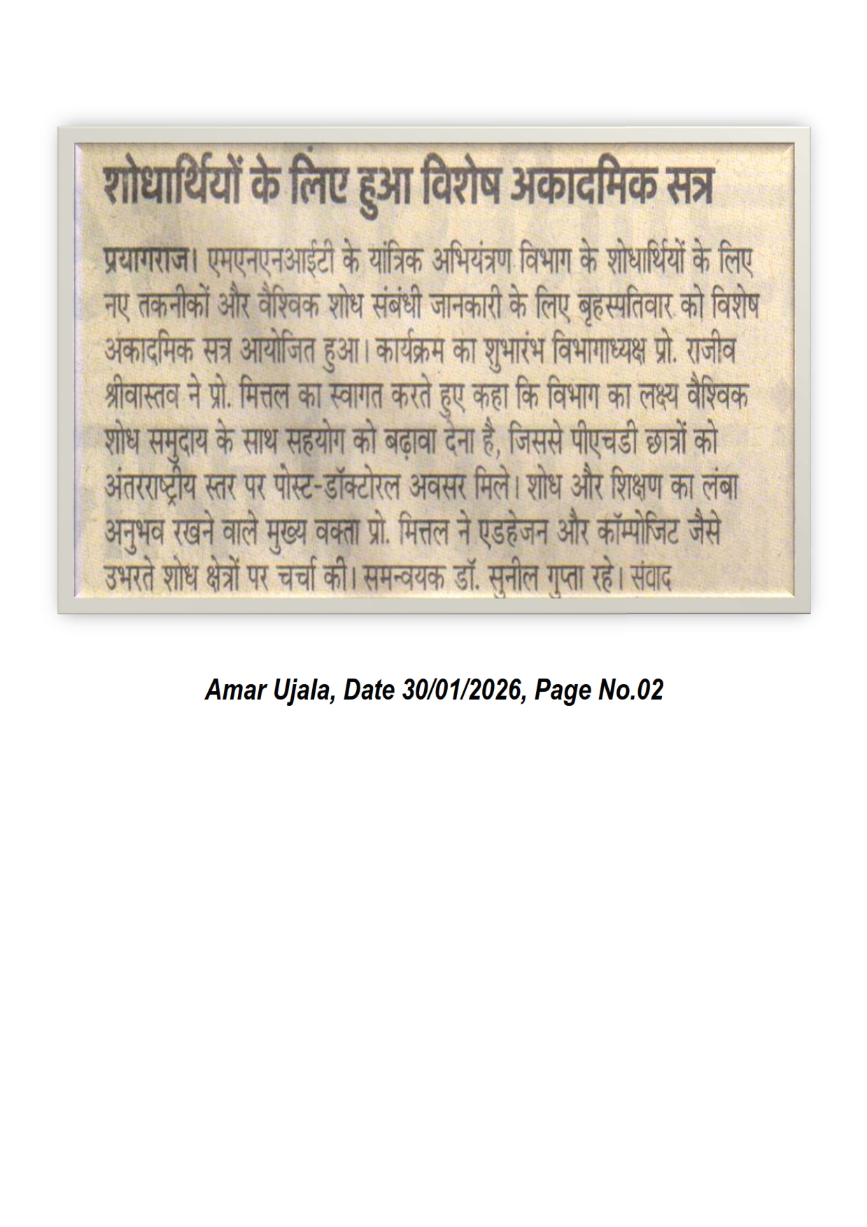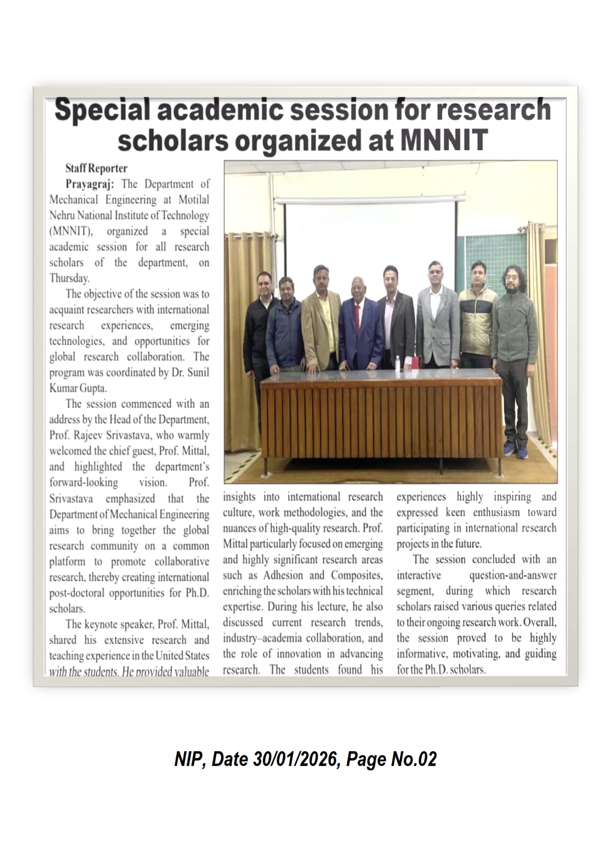 मोतीलाल नेहरु राष्ट्रीय प्रौद्योगिकी संस्थान इलाहाबाद के यांत्रिक अभियंत्रण विभाग के शोधार्थियों के लिए नए तकनीकों और वैश्विक शोध संबंधी जानकारी के लिए बृहस्पतिवार को विशेष अकादमिक सत्र आयोजित हुआ। कार्यक्रम का शुभारंभ विभागाध्यक्ष प्रो. राजीव श्रीवास्तव ने प्रो. मित्तल का स्वागत करते हुए कहा कि विभाग का लक्ष्य वैश्विक शोध समुदाय के साथ सहयोग को बढ़ावा देना है, जिससे पीएचडी छात्रों को अंतरराष्ट्रीय स्तर पर पोस्ट-डॉक्टोरल अवसर मिले। [Amar Ujala 30-01-2026, Page No. 02]