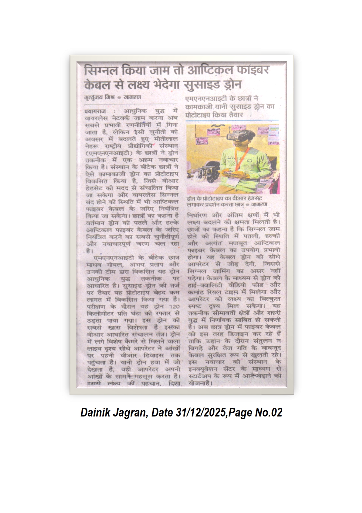 आधुनिक यु़द्ध में वायरलेस नेटवर्क जाम करना अब सबसे प्रभावी रणनीतियों में गिना जाता है, लेकिन इसी चुनौती को अवसर में बदलते हुए मोतीलाल नेहरु राष्ट्रीय प्रौद्योगिकी संस्थान इलाहाबाद के छात्रों ने ड्रोन तकनीक में एक अहम नवाचार किया है। संस्थान के बीटेक छात्रों ने ऐसे कामाकाजीक ड्रोन का प्रोटोटाइप विकसित किया है, जिसे वीआर हेडसेट की मदद से संचालित किया जा सकेगा और वायरलेस सिग्नल बन्द होने की स्थिति में भी आप्टिकल फाइबर केबल के जरिए नियंत्रित किया जा सकेगा। [Dainik Jagran 31-12-2025, Page No. 02]