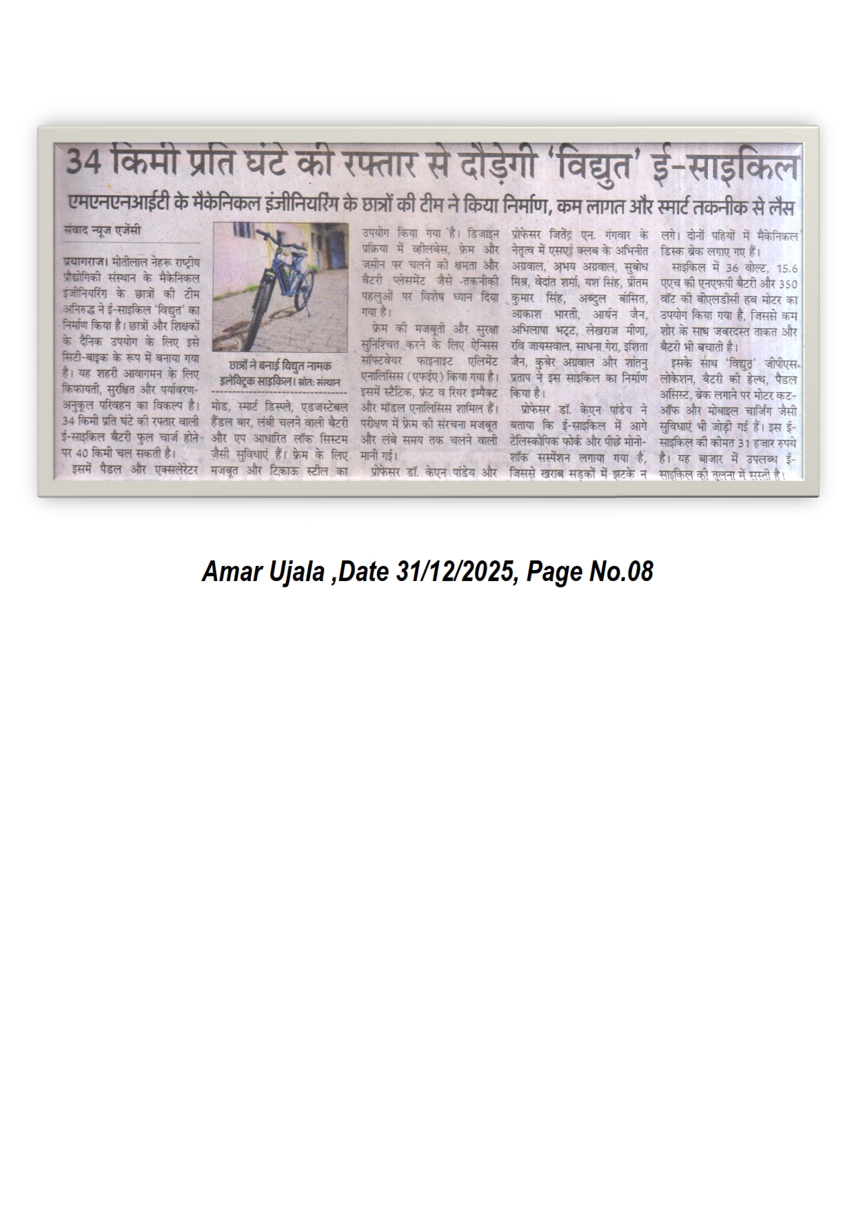 मोतीलाल नेहरु राष्ट्रीय प्रौद्योगिकी संस्थान इलाहाबाद के मैकेनिकल इंजीनियरिंग के छात्रों की टीम अनिरुद्ध ने ई-साइकिल ‘विद्युत’ का निर्माण किया है। छात्रों और शिक्षकों के दैनिक उपयोग के लिए इसे सिटी-बाइक के रूप में बनाया गया है। यह शहरी आवागमन के लिए किफायती, सुरक्षित और पर्यावरण अनुकूल परिवहन का विकल्प है। 34 किमी प्रति घंटे की रफ्तार वाली इ-साइकिल बैटरी फुल चार्ज होने पर 40 किमी चल सकती है। [Amar Ujala 31-12-2025, Page No. 08]