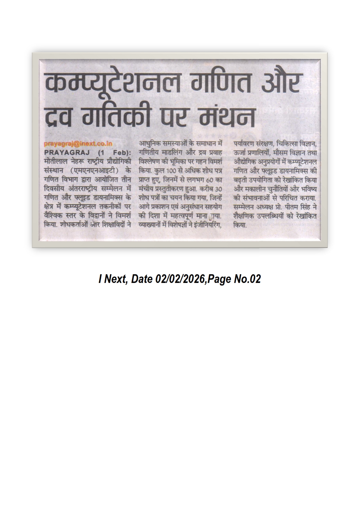 मोतीलाल नेहरु राष्ट्रीय प्रौद्योगिकी संस्थान इलाहाबाद के गणित विभाग के तत्वावधान में आयोजित तीन दिवसीय अंतरराष्ट्रीय सम्मेलन आईसीएएमसीएफडी-2026 का रविवार को समापन हुआ। सम्मेलन में देश-विदेश से आए वैज्ञानिक , शोधकर्ताओं और शिक्षाविदों ने गणित एवं फ्लूइड डायनामिक्स में कम्प्यूटेशनल तकनीकों से जुड़े शोध कार्यों पर विचार-विमर्श किया। [Amar Ujala 02-02-2026, Page No. 08]-B