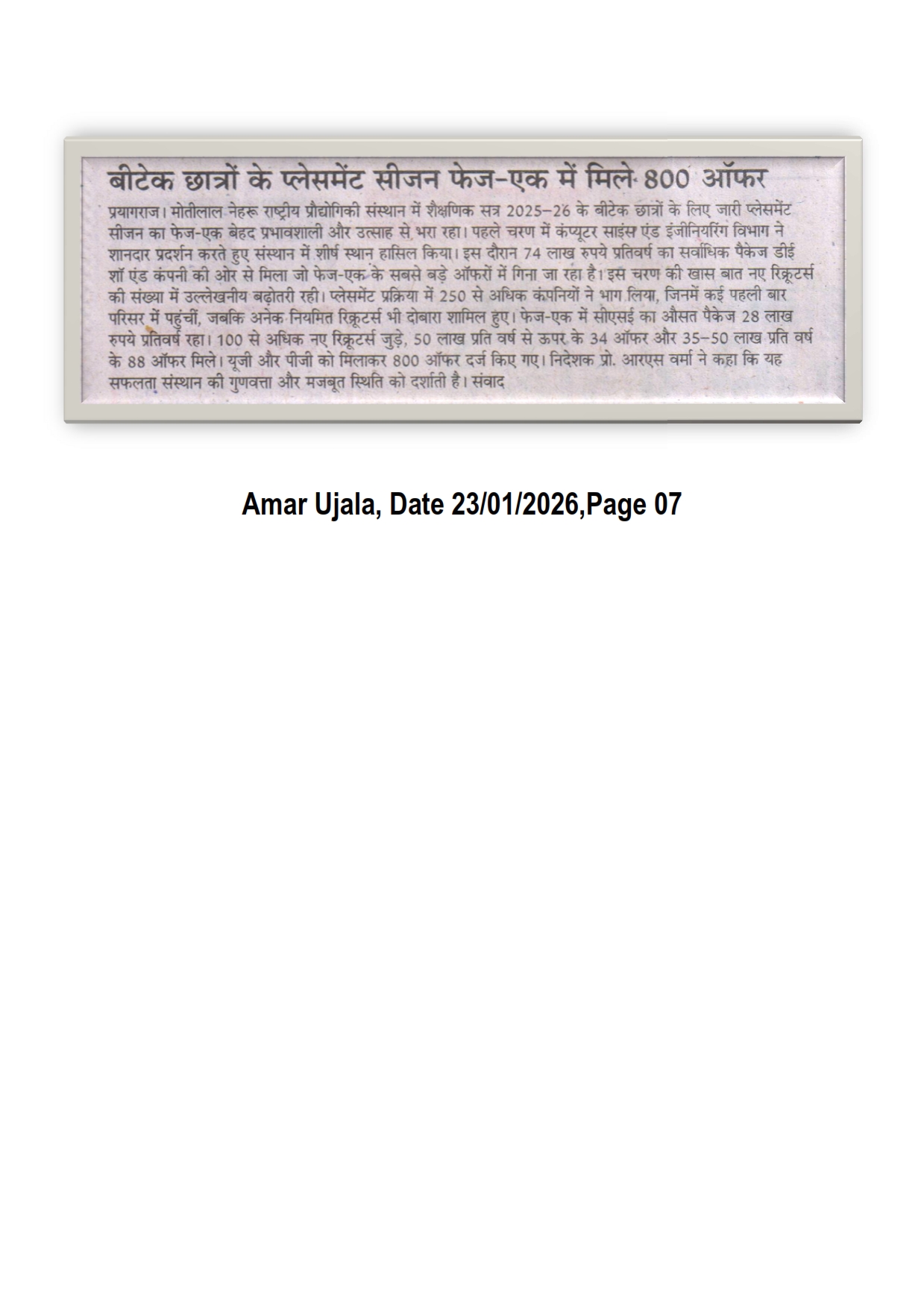 मोतीलाल नेहरु राष्ट्रीय प्रौद्योगिकी संस्थान इलाहाबाद के शैक्षणिक सत्र 2025-26 के बीटेक छात्रों के लिए जारी प्लेसमेंट सीजन का फेज-एक बेहद प्रभावशाली और उत्साह से भरा रहा। पहले चरण में कंप्यूटर साइंस एंड इंजीनियरिंग विभाग ने शानदार प्रदर्शन करते हुए संस्थान में शीर्ष स्थान हासिल किया। इस दौरान 74 लाख रुपये प्रतिवर्ष का सर्वाधिक पैकेज डीई शॉ एंड कंपनी की ओर से मिला जो फेज-एक के सबसे बड़े आफरों में गिना जा रहा है। [Amar Ujala 23-01-2026, Page No. 07]