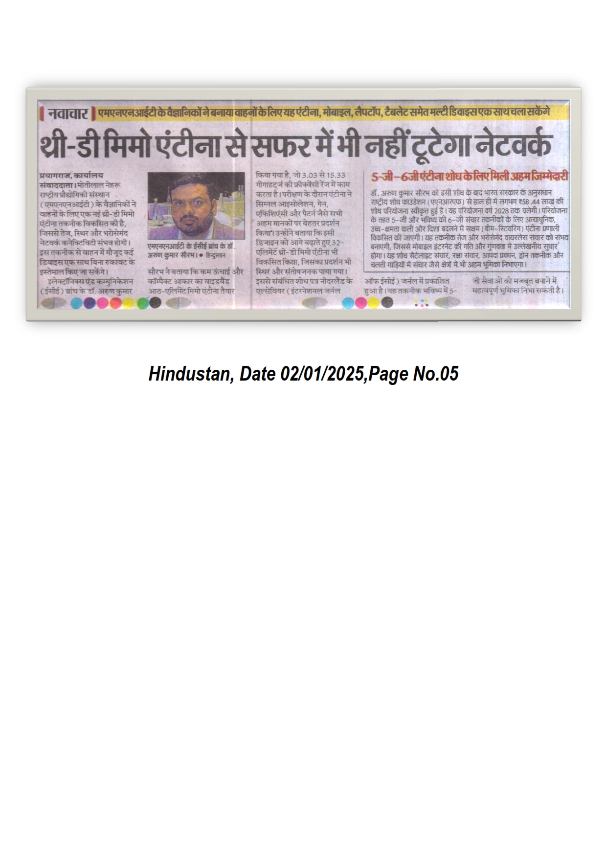 मोतीलाल नेहरु राष्ट्रीय प्रौद्योगिकी संस्थान इलाहाबाद के वैज्ञानिकों ने वाहनों के लिए एक नई थ्री-डी मिमो एंटीना तकनीक विकसित की है, जिससे तेज, स्थिर और भरोसेमंद नेटवर्क कनेक्टिविटी संभव होगी। इस तकनीक से वाहन में मौजूद नई डिवाइस एक साथ बिना रुकावट के इस्तेमाल किए जा सकेंगे। इलेक्ट्रानिक्स एंड क्म्युनिकेशन ब्रांच के डॉ. अरुण कुमार सौरभ ने बताया कि कम ऊंचाई और कॉम्पैक्ट आकार का वाइडबैंड आठ-एलिमेंट मिमो एंटीना तैयार किया गया है, जो 3.03 से 15.33 गीगाहर्ट्ज की फ्रीक्वेंसी रेंज में काम करता है। परीक्षण के दौरान एंटीना ने सिग्नल आइसोलेशन, गेन, एफिशिएंसी और पैटर्न जैसे सभी अहम मानकों पर बेहतर प्रदर्शन किया। [Hindustan 02-01-2026, Page No. 05]