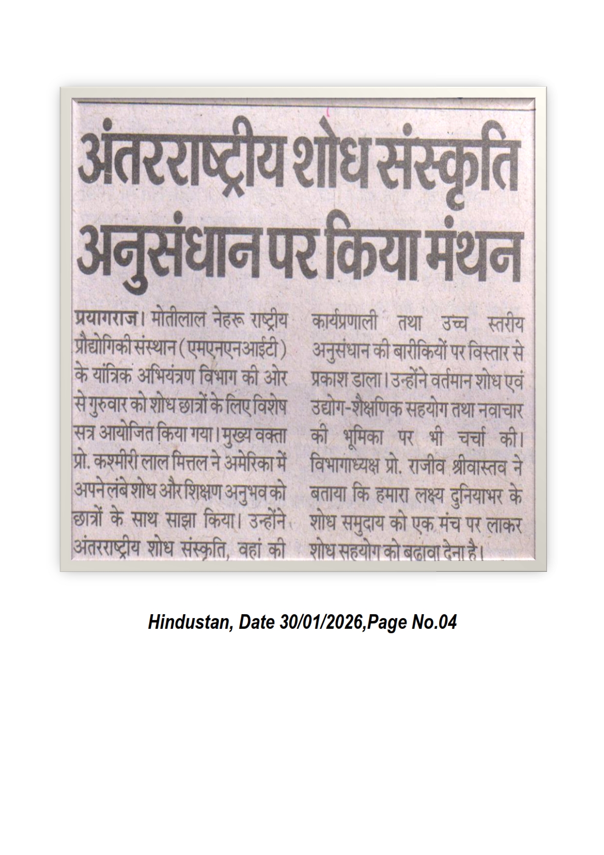 मोतीलाल नेहरु राष्ट्रीय प्रौद्योगिकी संस्थान इलाहाबाद के यांत्रिक अभियंत्रण विभाग में आयोजित विशेष अकादमिक सत्र शुरू हुआ। अमेरिका में अपने दीर्घकालीन शोध एवं शिक्षण अनुभवों को साझा करते हुए मुख्यवक्ता प्रो. कश्मीरी लाल मित्तल ने शोधार्थियों को अंतरराष्ट्रीय शोध संस्कृति, वैश्विक कार्यप्रणाली और उच्चस्तरीय अनुसंधान की बारीकियों से अवगत कराया। [Dainik Jagran 30-01-2026, Page No. 02]