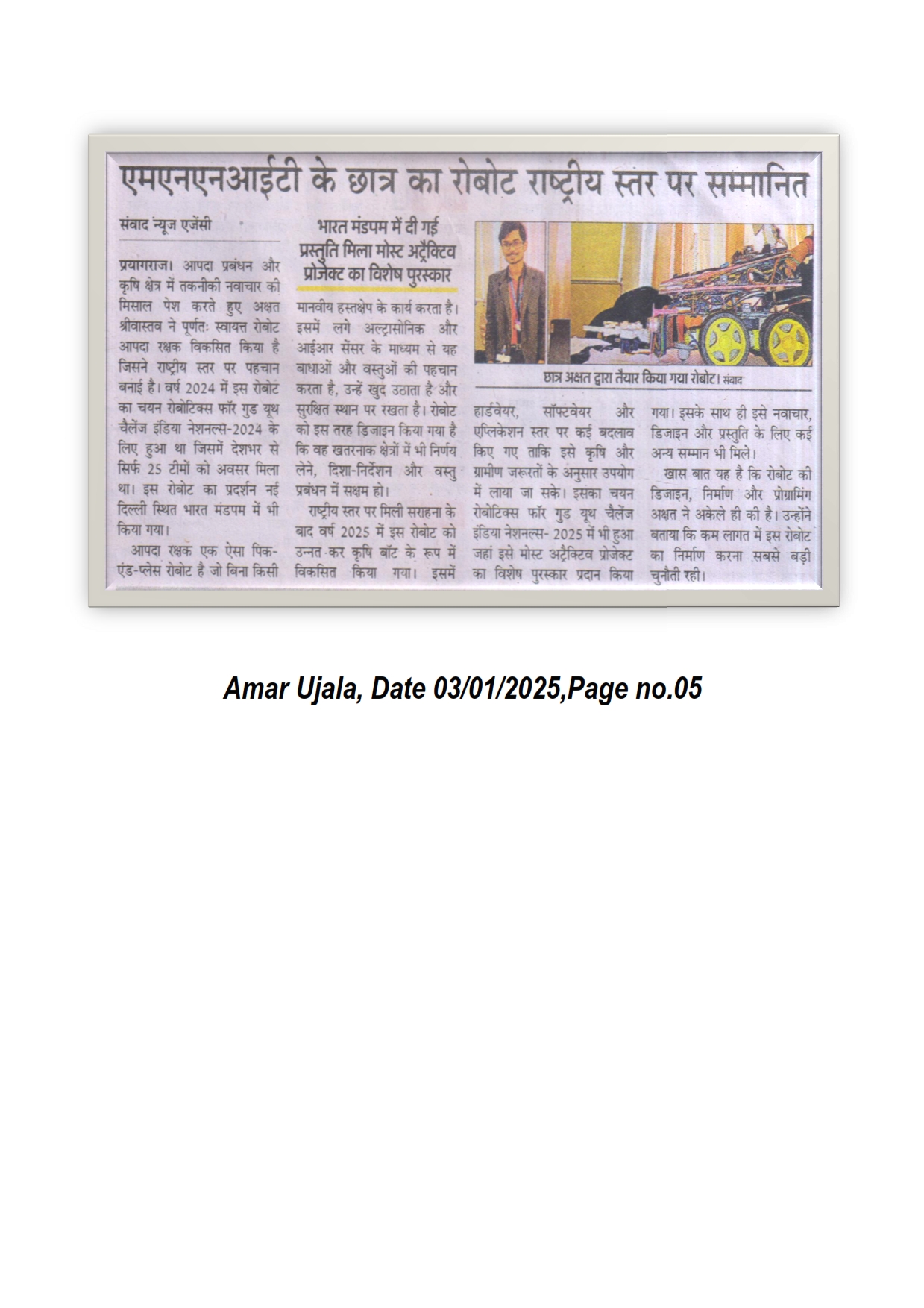 आपदा प्रबंधन और कृषि क्षेत्र में तकनीकी नवाचार की मिसाल पेश करते हुए अक्षत श्रीवास्तव ने पूर्णतः स्वायत्त रोबोट आपदा रक्षक विकसित किया है जिसने राष्ट्रीय स्तर पर पहचान बनाई है। वर्ष 2024 में इस रोबोट का चयन रोबोटिक्स फॉर गुड यूथ चैलेंज इंडिया नेशनल्स-2024 के लिए हुआ था जिसमें देशभर से सिर्फ 25 टीमों को अवसर मिला था। इसका चयन रोबोटिक्स फॉर गुड यूथ चैलेंज इंडिया नेशनल्स-2025 के लिए भी हुआ जहां इसे मोस्ट अट्रैक्टिव प्रोजेक्ट का विशेष पुरस्कार प्रदान किया गया। इसके साथ ही इसे नवाचार, डिजाइन और प्रस्तुति के लिए कई अन्य सम्मान भी मिले। [Amar Ujala 03-01-2026, Page No. 05]